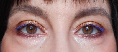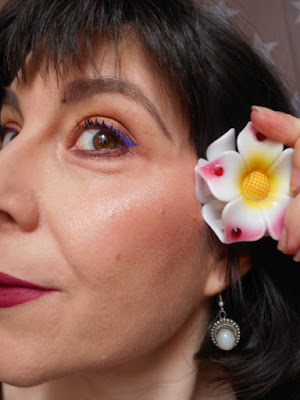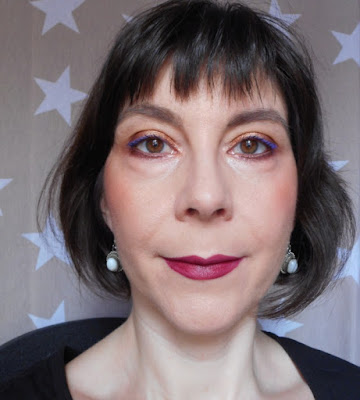 Para las pestañas he aplicado la máscara Stretch Lash de Isadora. Quise dar un toque de violeta en las puntas con el delineador, pero no se nota salvo si cierro los ojos. No fue buena idea.