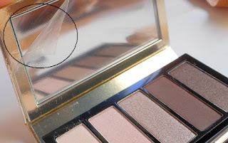 La lámina de plástico, mientras no la quites, protege el espejo; pero, una vez lo hagas, todo el polvito de las sombras se pegará a él (salvo que uses la cartulina de los looks como separador) Hay que elgir entre espejo protegido, o espejo útil.
