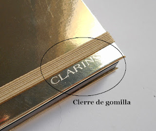 La cubierta es dorada, y de cartoncillo, asegurada con una gomilla elástica del mismo color.